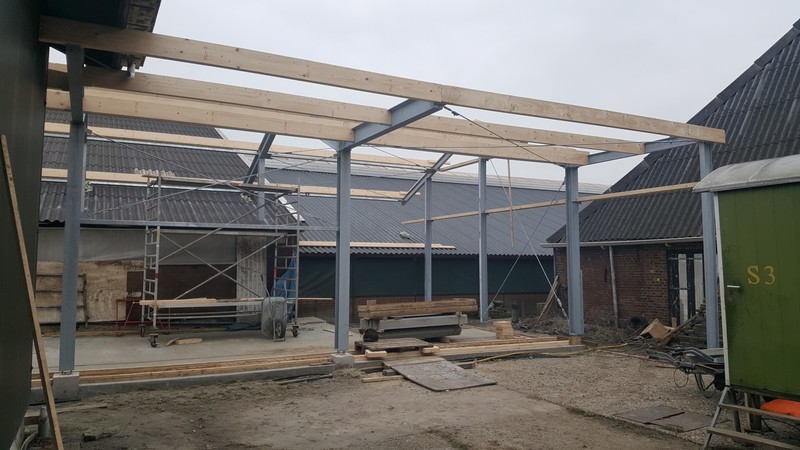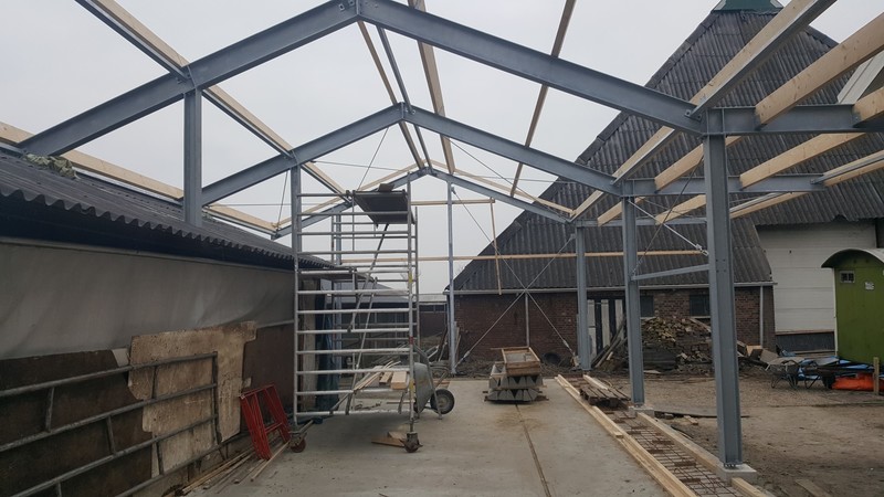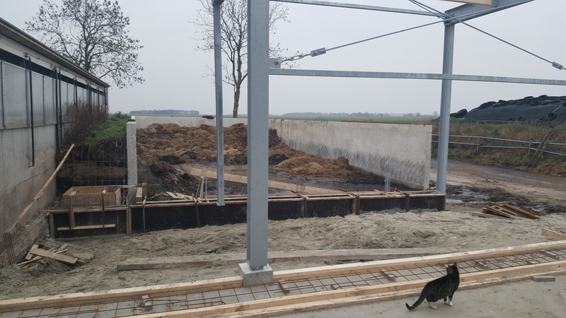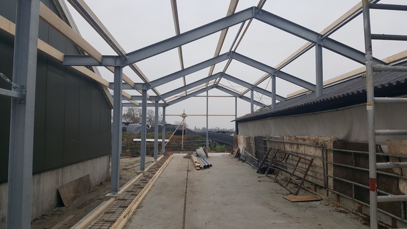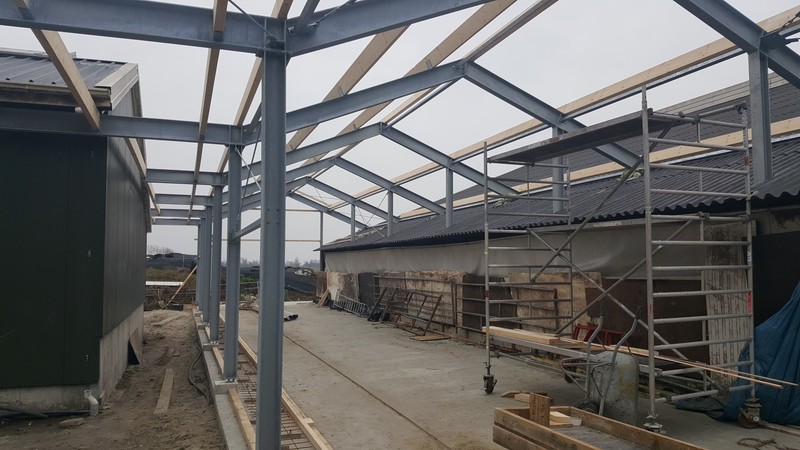 November 2018 is de aannemer opgestart met een uitbreiding van de bestaande ligboxenstal. Deze is gesitueerd tussen de stal- de boerderij en de jongveestal. De nieuwe ruimte bied plaats aan ruim 20 stuks melkvee. Hierdoor kunnen alle melkkoeien aan 1 zijde van de stal worden gehuisvest. De andere zijde van de huidige stal zal worden aangepast voor het oudere jongvee , de droge koeien en strohokken. Alle vee onder 1 dak. De uitbreiding wordt voorzien diepstrooisel boxdekken gevuld met zand. De loopvloer van een dichte betonvloer met afschot naar de midden. Een mestschuif brengt de dunne fractie via een afstortrooster naar de kelders. De dikke fractie valt achter op de beton erfverharding waarna het in de naastgelegen mestvaalt wordt geschoven