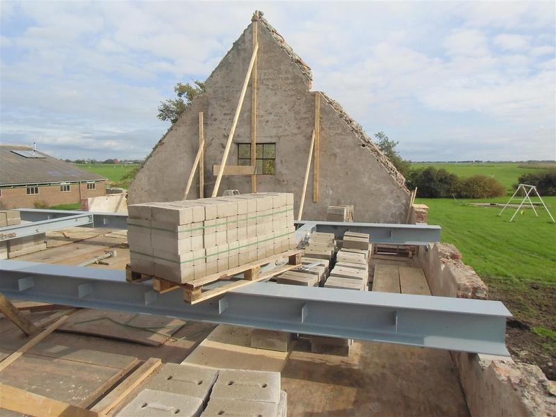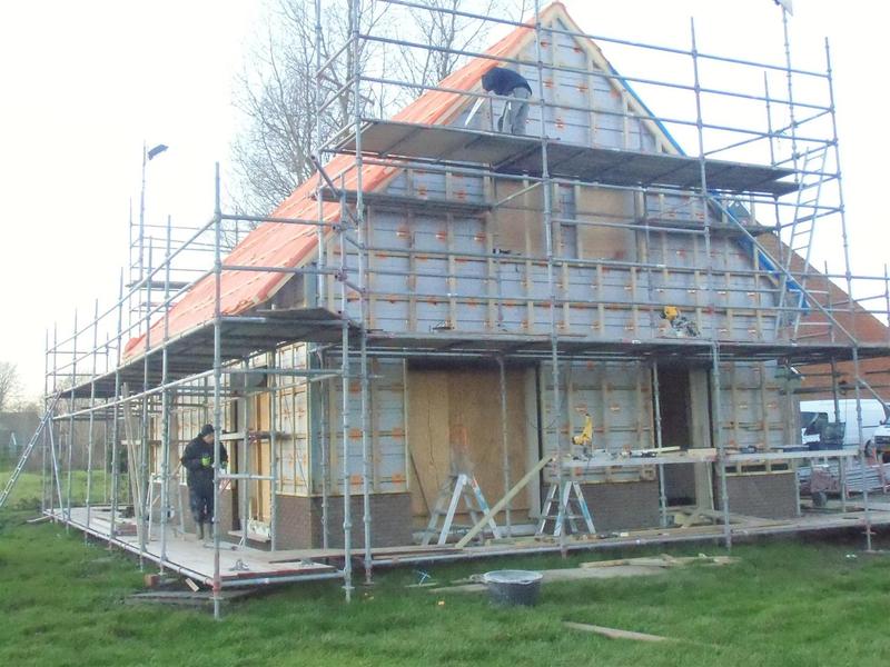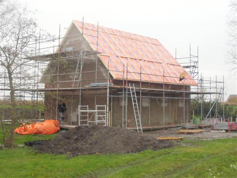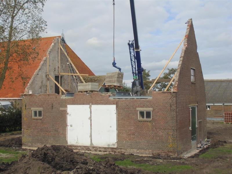 Boersma Balk  heeft inmiddels  de bestaande betonnen grupvloer van binnen uit  gesloopt en stalen buispalen aangebracht. Tevens graaft Boersma Balk alles uit tot de gewenste diepte. Bouwbedrijf Zeilstra gaat volgende week verder met de fundering + geïsoleerde betonvloer. Daarna wordt er een nieuwe houten verdiepingsvloer geplaatst (ruim een halve meter hoger dan de bestaande) Zodra deze vloer er in zit, wordt de kap met riet en pannen  geheel verwijderd. Rondom zal het knieschot hoger worden opgemetseld voor meer hoogte op de verdieping. Volgende stap is de nieuwe geisoleerde scharnierkap er op en bedekken met de bestaande oude rode pannen. Zodra dit constructieve werk is gedaan gaan we de oude steens muren een nieuwe indeling geven. M.a.w. betonramen + schuifdeuren er uit en nieuwe kunststof ramen en schuifpuien van Jansma Burdaard er in. Als laatste onderdeel komt de nieuwe schil er om heen : Borstwering van rood/bruin-genuanceerde kbaksteen met daarboven een geisoleerde HSB -wand. Als eindafwerking worden rondom alle gevels bekleed met horizontale houten delen ; Zweeds rabat, fijn bezaagde planken, in een naturel; lichtbruin-grijze kleur.