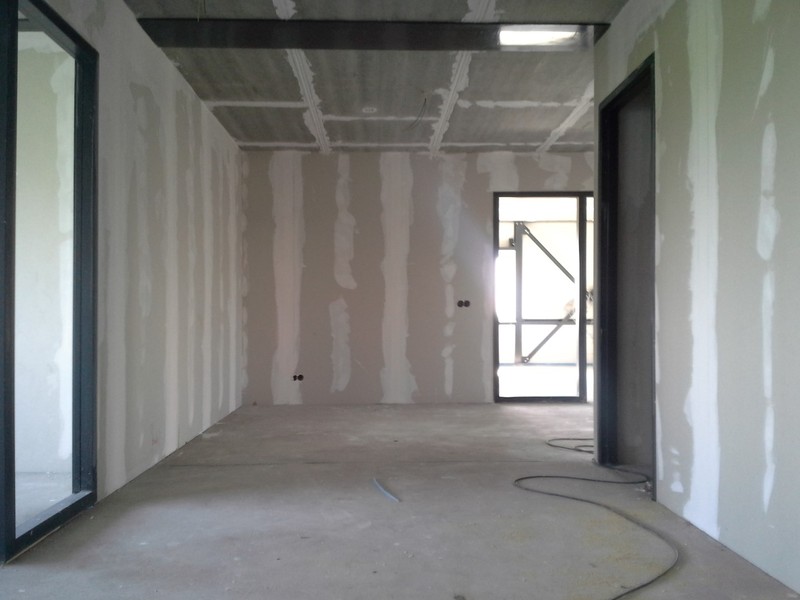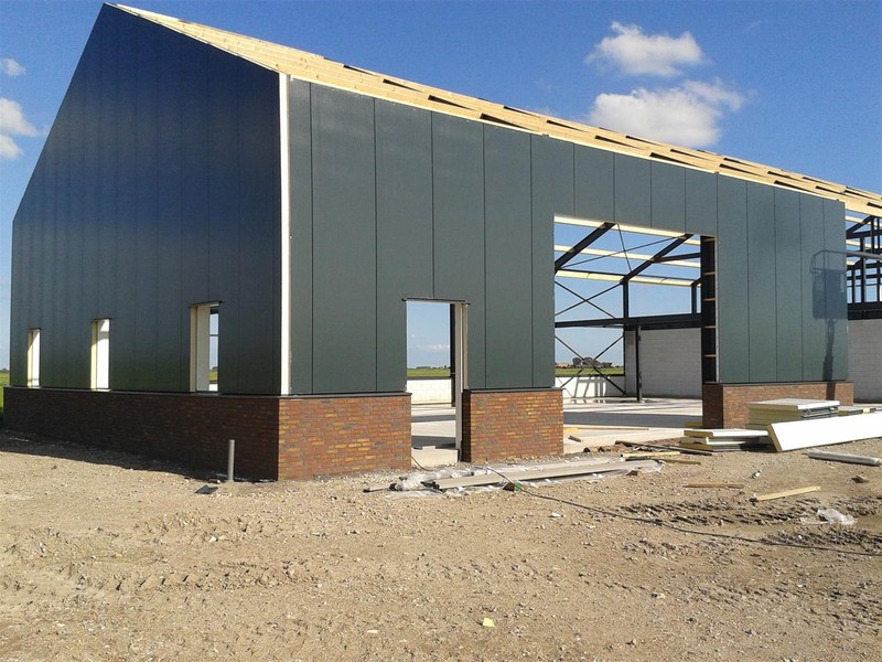 Op de Joodijk 9B is BBT- Agribouw in april 2015 gestart met de nieuwbouw van hun eigen bedrijfspand met inpandig kantoor. Het gebouw meet ca 15*40 m2 waarvan 3 spantvakken op de b.g.g. worden ingedeeld als kantoor. Er wordt direct een betonnen kanaalplaat als verdiepingsvloer gelegd zodat er in de toekomst simpel kan worden uitgebreid als woonbestemming of voor het bedrijf. Van de overige 5 spantvakken in de loods worden de buitenste vakken voorzien van houten zolders. Tussen loods en kantoor een geïsoleerd en brandwerend sandwichpaneel. Het pand wordt geheel onderheid en voorzien van een in het werk gestorte constructievloer. Loods gevlinderd en kantoorvloer aan onderzijde geïsoleerd en aan bovenzijde te voorzien van vloerverwarming. Draagconstructie van stalen spanten gepoedercoat kleur antraciet. Borstwering rondom van spouwmuur. Binnenzijde vellingblokjes, buitenzijde metselwerk bruinrood genuanceerd. Gevels van sandwichpaneel microrib antraciet Rc 4.5. Strakke industriële aluminium kozijnen met zonwerend HR +++ glas kleur antraciet. Goten van getrokken aluminium, dakranden van gezet staal in de kleur donkergrijs. Dak van sandwichpaneel TR – 5 kroons Rc 5.0 kleur zwart. Tevens 2 overheaddeuren 4.5 * 4 m2 met glassecties geheel in bijpassende antracietkleuren. Naast het bedrijfspand aan de noordzijde is nog een kapschuur vergund van 7.5*25 m2 oppervlak. Aan de zuidzijde is nog voldoende ruimte gehouden voor een toekomstige bedrijfswoning.