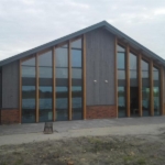 van verzinkte stalen spantconstructie, houten dakgordingen en houtskeletbouw buitenmuren. Rondom worden de wanden bekleed met bruin/antraciet